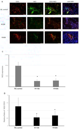 Inhibition of REST decreased the number of vascular endothelial cells and pericyte coverage in tumor vessels. (A) The endothelial marker CD31 (red) was used to identify tumor vascular structure by immunofluorescence staining. White arrows indicate the punctate lumens. Scale bar: 50 µm. (B) Double staining for the pericyte marker NG2 (green) and endothelial marker CD31 (red) was performed in the different tumor tissues to assess vascular pericytes coverage. NG2 expression and NG2 + CD31 dual-positive vessels were decreased in the R1106 and R1606 tumors compared with the RC-control tumors. White arrows indicate double positive staining (yellow color). Scale bar: 50 µm. (C) Mean NG2 expression in each of the tumor groups was quantified. Bars represent standard deviation. * p < 0.01. (D) The ratio of NG2 to CD31 was calculated in each tumor. Bars represent standard deviation. * p < 0.01.