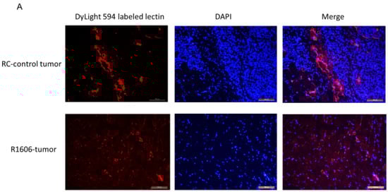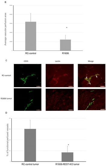 Lectin binds to glycoproteins located in the glycocalyx and in the basal membrane of endothelial cells. Intravenous injection of DyLight 594–labeled Lycopersicon esculentum (tomato) lectin is perfused through blood flow and bound inside the vessels. Functional vessels display red fluorescence color from bound DyLight 594–labeled tomato lectin, which can be visualized and quantified [26,27]. The endothelial marker CD31 shows total vessels, including both the perfused and non-perfused vessels. Thus, 24 days after the subcutaneous injection of RC-control or R1606 REST-KO cells (5 mice per group), each mouse was injected in the tail vein with 100 uL of DyLight 594–labeled tomato lectin (Vector Laboratories). The mice were euthanized 5 min later, and tumor tissues were separated and frozen in optimal cutting temperature medium (OTC) on dry ice. The tumor samples were sectioned and mounted in Vectashield HardSet with 4′,6-diamidino-2-phenylindole (DAPI) (VECTOR LABORATORIES, Burlingame, CA, USA). Perfused vessels were visualized as red tumor vessels under Leica fluorescence microscopy (Leica Microsystems, Buffalo Grove, IL, USA). The tumor tissues were then stained with FITC-labeled CD31 (green). Functional vessels were indicated by yellow fluorescence, which is the co-localization of FITC-labeled CD31 green and lectin-perfused red vessels. Co-localization of lectin and CD31 double-positive vessels and total CD31-positive vessels were quantified in 10 randomized fields from different tumor samples using SimplePCI software (Hamamatsu Photonics, Bridgewater, NJ, USA). The percentage of perfused vessels among total vessels was calculated.