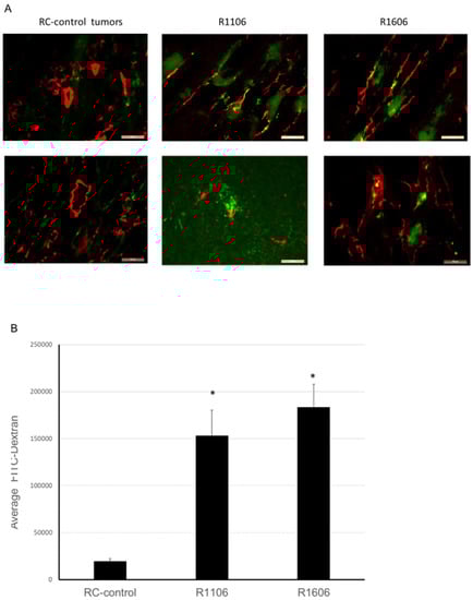 Dextran labeled with FITC (Sigma-Aldrich) was used to assess vessel permeability. Normal blood vessels are not permeable to substances with high molecular weight, including dextran (2 × 106 kDa); when vessel permeability increases, dextran leaks to the tissue outside of the vessels [28]. Therefore, 100 μL of FITC-labeled dextran (10 mg/mL) was intravenously injected into the mice bearing RC-control, R1106 REST-KO, or R1606 REST-KO tumors 5 min before the mice were sacrificed (three groups tumor-bearing mice, 5 mice per group). The harvested tumor tissues were then frozen and sectioned, and CD31 immunofluorescence staining was performed. Texas Red-conjugated anti-rat IgG was used as the secondary antibody. The FITC-labeled dextran area (green) outside of vessels (red, CD31-positive) indicated leaky blood vessels. The FITC-positive area was quantified in 10 different microscopic fields from different tumor samples using SimplePCI software (Hamamatsu Photonics, Bridgewater, NJ, USA), and average positive area was calculated.
