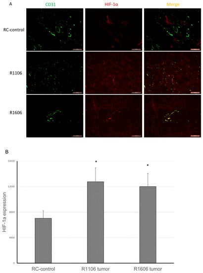 Decreased vascular perfusion and increased vessel permeability have been shown to increase tumor tissue hypoxia and apoptosis. We therefore quantified tumor hypoxia and apoptosis in the REST-KO and RC-control tumors. Hypoxia-inducible factor-1α (HIF-1α) was used to detect hypoxic areas. HIF-1α expression was significantly increased in both R1106 and R1606 REST-KO tumor tissues compared with RC-control tumors (Figure 6A,B).