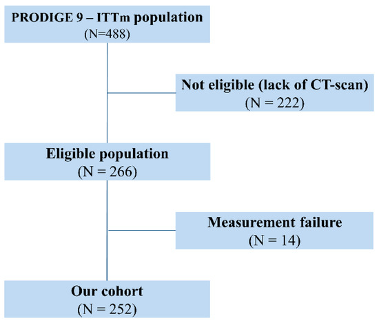 Out of the 488 patients included in the modified intention-to-treat population of the PRODIGE-9 study, 266 with available CT scan and written informed consent for sub-studies were eligible for the present analysis. Of these, 14 were excluded because their CT scan was not amenable to measurement of the spleen because of technical problems or splenectomy (Figure 1). Two hundred and fifty-two patients were thus included in the present analysis. The characteristics of the cohort were representative of those of the PRODIGE-9 patients (Table 1). Only 55 patients (21.8%) had received adjuvant chemotherapy for localized CRC before inclusion in PRODIGE-9.