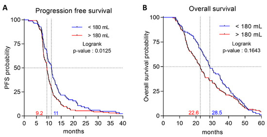 Overall, at the last follow-up, 248 patients progressed or died; only 4 patients did not progress and were censored. We first analyzed baseline splenic volume as a continuous variable. Univariate Cox analyses identified nine factors significantly (p < 0.05) associated with PFS (Table 2), including baseline splenic volume (HR 1.001; 95CI% [1–1.002]; log-rank p = 0.05). Multivariate Cox analyses identified four significant prognostic factors for PFS (Table 2), including baseline splenic volume (HR 1.001; 95%CI [1.000–1.0003]; log-rank p = 0.01). Next, we analyzed baseline splenic volume as a binary variable. Using the median of baseline splenic volume (214 mL) as the cut-off, no difference in PFS was demonstrated. We then sought to identify the threshold with the best discriminatory power, using Cutoff Finder software. The baseline splenic volume threshold retained was 180 mL with a sensitivity of 67.3% (61.3–72.9%) and a specificity of 50% (15–85%). Using this threshold in univariate Cox analysis, baseline splenic volume was identified as a prognostic factor for PFS (HR 1.403; 95%CI [1.073–1.834]; log-rank p = 0.01). By multivariate Cox analysis, the baseline splenic volume threshold of 180 mL was found to be significantly associated with PFS (HR 1.362; 95%CI bootstrapped [1.338–1.370]; p = 0.0249) (Table 3), and the stability of the model was verified using a bootstrap with 500 replications. Harrell’s C-index for the baseline splenic volume threshold at 180 mL was 0.84 (95%CI [0.75–0.93]). In our cohort, baseline splenic volume was ≤180 mL in 83 patients (32.9%), and > 180 mL in 169 patients (67.1%). The Kaplan–Meier curves showed that baseline splenic volume > 180 mL was associated with poor PFS (median PFS = 9.2 vs. 11.1 months, >180 mL vs. ≤180 mL respectively; log-rank p = 0.0125) (Figure 2A).