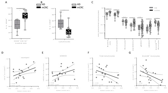 Association between blood parameters and spleen volume. (A,B) Comparison of myeloid and lymphocyte cell proportions in mCRC and peripheral blood leukocytes from matched healthy donors (HD). (C) Myeloid subset/lymphocyte ratio in mCRC and matched healthy donors. (D–G) Correlation between spleen volume and the proportion of granulocytes, mMDSC, lymphocytes and activated HLA-DR+ monocytes respectively.