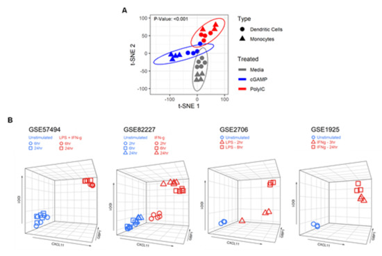 Identification of a three gene signature characteristic to activated myeloid cells. (A) Dendritic cells (DC) and CD14+ monocytes were isolated from healthy donors and stimulated with poly(I:C) (10 µg/mL) or cGAMP (10 μg/mL) for 6 h in vitro. Gene expression counts were quantified using the NanoString nCounter Immunology Panel. Unsupervised t-Distributed Stochastic Neighbor Embedding (t-SNE) analysis showed significant clustering between unstimulated and stimulated cells for both monocytes and DC. (B) IDO1, CXCL11, and GBP1 expression values (RNA-seq, microarray) of unstimulated and stimulated myeloid cells using public Gene Expression Omnibus (GEO) datasets: GSE57494 (LPS + IFNγ), GSE82227 (IFNγ), GSE2706 (LPS), and GSE1925 (IFNγ) plotted as 3D scatter plots using the R package plotly and show clustering between unstimulated and stimulated cells.