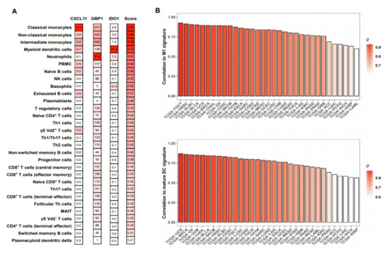 To investigate whether the gene signature (Cxcl11, Gbp1, and Ido1) is specific to activated myeloid cells, we tested whether these genes were upregulated in activated non-myeloid cells (NK cells, B cells, CD8, and CD4 T cells) (GSE63038, GSE85543, GSE79626, GSE60235, respectively). None of the three signature genes was upregulated in activated non-myeloid immune cells, suggesting a selective induction in activated myeloid cells (Supplementary Table S1). Considering the complexity of the immune cell composition in blood and tissue, which can impede the detection of gene signatures, we investigated the expression of our MA signature in RNA-seq data from peripheral blood mononuclear cells (PBMC), comprising 29 distinct immune cells [16]. We found that the baseline expression of Cxcl11, Gbp1, and Ido1 in lymphoid cells was lower than in steady-state myeloid cells. Furthermore, the expression of the signature genes was highest in myeloid cells as indicated by a non-parametric, rank-based score (Figure 2A).