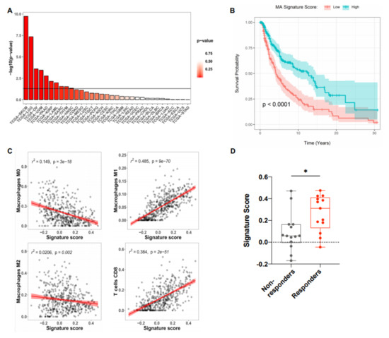 Given the important function of M1 macrophages and mature DC within the tumor microenvironment (TME), we investigated the direct association of the MA signature with overall survival (OS) in all cancer types available in TCGA [19]. Survival analysis using log-rank test showed strong association between MA signature and overall survival (OS) in various cancer types (Figure 3A).