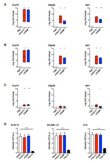 To further validate the use of the MA signature in vivo, we used the well-established murine B16F10 melanoma model. Initially, B16F10 melanoma cells were analysed for the expression of the MA signature genes after stimulation with poly(I:C) or cGAMP for 24 h in vitro. The only signature gene that was marginally upregulated in B16F10 cells upon stimulation with poly(I:C) or cGAMP was Cxcl11 (Figure 4C). However, the magnitude of induction was approximately five-fold lower as observed in BMDM (Figure 4A,B). In addition, poly(I:C) and cGAMP were investigated for their cytotoxic effect on B16F10 melanoma cells and the human melanoma cell lines SK-Mel-37 and D10 using an AlamarBlue assay. However, cell viability was not affected in any of the tested cell lines upon incubation with poly(I:C) or cGAMP (Figure 4D).