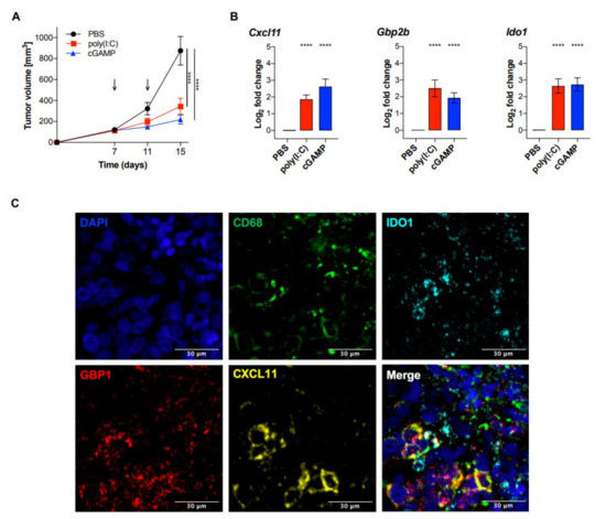 RNA was extracted from whole tumor tissue and analyzed for the expression of Cxcl11, Gbp2b, and Ido1. Each of the three MA signature genes showed a significant increased expression in both poly(I:C) and cGAMP treated mice, compared to PBS treated controls (Figure 5B). Taken together, our findings suggest a potential use of the three genes Cxcl11, Gbp2b, and Ido1 as a signature for myeloid cell activation in whole tumor tissue and will be further investigated as a clinical prognostic biomarker for melanoma patients.