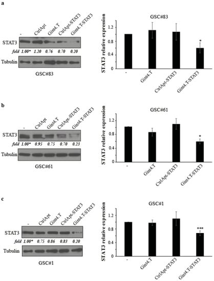To further investigate the Gint4.T-STAT3 functional effect, we measured the cell viability and cell count of treated GSCs. In all the three lines, the MTT analysis showed that the AsiC treatment induces a 20–30% reduction of cell viability (Figure 3a–c). In addition, the cell count reached about 60–70% compared to the untreated cells or control conjugate upon Gint4.T-STAT3 treatment (Figure 3d–f).