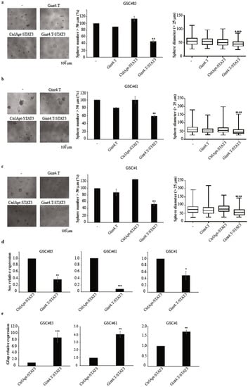 In addition, we found that the inhibition of the self-renewal potential of the AsiC-treated spheres correlates with the reduction of the stem-cell associated gene SRY-Box 2 (Sox-2), as detected by RT-qPCR and immunoblot (Figure 2d). Conversely, a clear increase in the differentiation marker Glial fibrillary acidic protein (GFAP) levels (Figure 2e) was detected upon Gint4.T-STAT3 treatment in all the three GSCs tested.