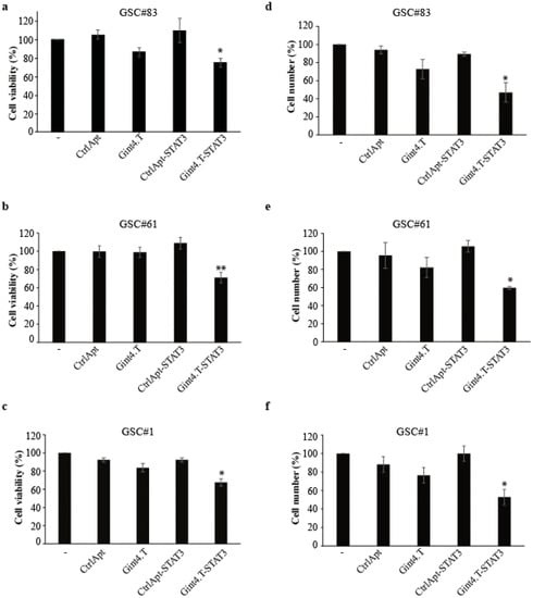 Gint4.T-STAT3 effect on GSC growth. (a–f) Indicated GSCs (PDGFRβ+) were left untreated (−) or treated with indicated aptamer or conjugates (400 nmol/L) for 72 h. (a–c) Cell viability was measured and expressed as the percentage of the viable cells with respect to the untreated cells. (d–f) The cell number was counted and expressed as the percentage relative to the untreated cells. In (a–f), statistics were obtained by one-way ANOVA: *, p < 0.05; **, p < 0.01 (Gint4.T-STAT3 versus control sample). Vertical bars depict the mean ± SD (n = 2).