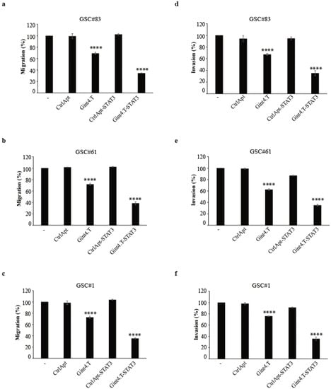Stem-like cancer cells are endowed with a high motility potential and can migrate in vitro in the presence of a chemoattractant stimulus. Since we have previously reported that the Gint4.T aptamer hampers cell migration [32] and that the aptamer synergizes with STAT3 siRNA to interfere with cell migration of differentiated GBM cells [25], we then determined whether this function might be as well preserved on GSC motility. GSCs were left either untreated or treated with Gint4.T, CtrlApt, CtrlApt-STAT3, or Gint4.T-STAT3 for 24 h, and their migration ability was monitored by Boyden chamber assays. As shown in Figure 4a–c and Figure S2a, the treatment with AsiC reduced cell migration by approximately 60–65%, further enhancing the ability of Gin4.T to alter cell mobility (30% reduction). No reduction was found upon treatment with control aptamer or conjugate. Next, we analysed the AsiC ability to interfere with the invading capability of GSCs. To this end, pre-treated GSCs were plated on Matrigel-coated filters and allowed to migrate. We found that a cell’s ability to migrate through the Matrigel in the presence of 10% FBS was significantly prevented in the presence of Gint4.T (30–40% reduction) and further inhibited by STAT3 AsiC, reaching about 65% inhibition as compared to the control aptamer or conjugate (Figure 4d–f and Figure S2b).
