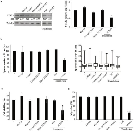 Gint4.T-STAT3 specificity. (a) GSC#144 (PDGFRβ−) were left untreated (−), treated with indicated aptamer or conjugates (400 nmol/L), or transfected with siSTAT3 (100 nmol/L) for 72 h, as indicated. Left panel: Cell lysates were immunoblotted with anti-STAT3 and anti-tubulin (used as a loading control) antibodies. Values below the blots indicate quantization relative to the control samples (labelled with asterisks) normalized on the loading control signals. Right panel: STAT3 mRNA levels were measured by RT-qPCR. Vertical bars indicate the mean ± SD (n = 2). (b) Sphere formation of GSC#144 (PDGFRβ−) left untreated (−), treated, or transfected, as indicated. Left panel: Spheres with a diameter > 50 μm were counted and expressed as the percentage relative to the untreated samples (−), set to 100%. Mean ± SD (n = 2) is reported. Right panel: Boxplot representation of diameter measures (spheres with a diameter > 25 μm). (c) Cell viability of GSC#144 (PDGFRβ−) following 72 h of indicated treatment (400 nmol/L) or transfection (100 nmol/L). Vertical bars: Mean ± SD (n = 2). (d) Cell migration of GSC#144 (PDGFRβ−) following 24 h of indicated treatment (400 nmol/L) or transfection (100 nmol/L). Vertical bars: Mean ± SD (n = 3). In (c,d), results are expressed as percentages with respect to the untreated cells. In (a–d), the statistics were obtained by one-way ANOVA: *, p < 0.05; **, p < 0.01; ****, p < 0.0001. Whole blots of Figure 5a are shown in Figure S8.