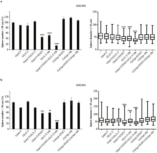 Gint4.T-STAT3 and GL21.T-10b combined effect on primary GSC tumour sphere formation. (a,b) Sphere formation of indicated primary GSC-derived tumour spheres (PDGFRβ+) left untreated (−) or treated with Gint4.T; Gint4.T-STAT3 or CtrlApt-STAT3; GL21.T-10b; or control aptamers—alone or in combination, as indicated. Left panels: Spheres with a diameter >50 μm were counted and expressed as the percentage relative to the untreated samples (−), set to 100%. Vertical bars depict the mean ± SD (n = 2). Right panels: Boxplot representation of the diameter measures (spheres with a diameter > 25 μm). Statistics of the conjugate treatments versus the untreated samples were obtained using one-way ANOVA: **, p < 0.01; ***, p < 0.001; ****, p < 0.0001.