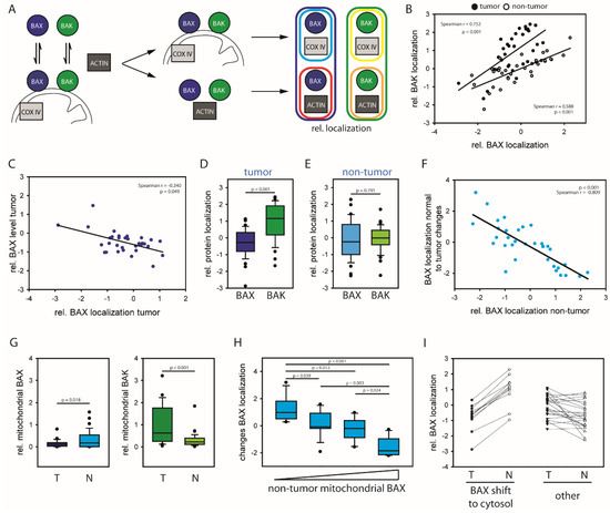 (A) BAX and BAK constantly translocate to the mitochondria and retrotranslocate back into the cytosol. Localization equilibriums are characterized by determining relative mitochondrial protein (rel. mitochondrial BAX (cyan), mitochondrial BAX (blue circle) per COX IV (light gray rectangle), rel. mitochondrial BAK (yellow), mitochondrial BAK (green circle) per COX IV (light gray rectangle)), and relative cytosolic protein (rel. cytosolic BAX (red), combining cytosolic BAX (blue cycle) with β-ACTIN (dark gray rectangle); rel. cytosolic BAK (orange), combining cytosolic BAK (green cycle) with β-ACTIN (dark gray rectangle)). Relative protein localization (BAX: blue; BAK: green) is the quotient of relative mitochondrial protein and relative cytosolic protein. High relative protein localization values indicate shift towards the mitochondria independent of the cellular protein concentration. (B) Relative BAX localization vs. relative BAK localization (double log10 scale) for 34 HCC patient samples (full circle) and corresponding non-tumor samples (open circle). R- and p-values according Pearson’s correlations. (C) Relative BAX localization in tumor tissue vs. relative BAX level in tumor samples (double log10 scale) for 34 patient samples. R- and p-values according Pearson’s correlations. (D) Relative BAX/BAK localization in 34 HCC patient tumor tissues (log10 scale). p-value according to t-test. (E) Relative protein localization (log10 scale) of BAX and BAK in 34 HCC patient non-tumor tissue samples. p-value according to t-test. (F) Relative BAX localization in non-tumor tissue vs. changes in relative BAX localization between non-tumor and tumor samples from 34 HCC patients (double log10 scale). R- and p-values according Pearson’s correlation. (G) Relative mitochondrial BAX (left) and BAK (right) levels for tumor (T) and non-tumor (N) samples from 34 HCC patients. p-value according to t-test. (H) Changes from non-tumor to tumor relative BAX localization of 34 HCC categorized according to the mitochondrial BAX levels in non-tumor tissue (N = 8 for extreme levels each and N = 9 for moderate levels each). p-value according to One Way ANOVA using Holm-Sidak method. (I) Relative mitochondrial BAX levels for tumor (T) and non-tumor (N) samples from 11 HCC patients with pronounced cytosolic BAX shift from non-tumor to tumor samples compared to samples without this shift (N = 23).