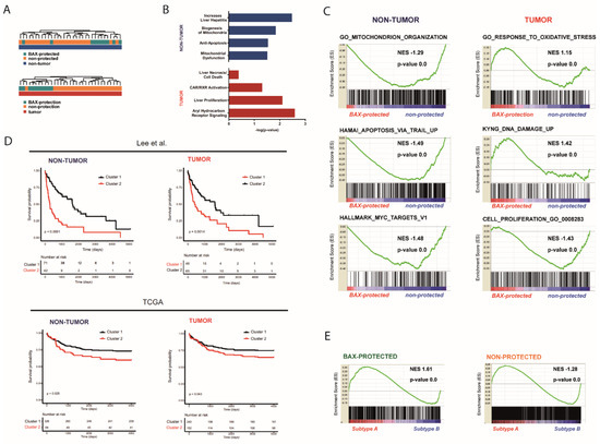 (A) Unsupervised clustering analyses based on genes differently regulated between BAX-protection and non-protection subgroups in non-tumorous and tumor tissue. (B) Activated signaling pathways between BAX-protected and non-protected subgroups in non-tumorous and tumor tissue identified by Ingenuity pathway analyses. (C) Gene set enrichment analysis (GSEA) for non-tumorous and tumor tissue. Normalized enrichment score (NES) reflects degree of overrepresentation for each group at the peak of the entire set. Statistical significance calculated by nominal p-value of the ES by an empirical phenotype-based permutation test. (D) Kaplan–Meyer analyses based on the specific transcriptome profiles in non-tumorous and tumor tissue using public available data from authentic human HCC of 139 patients from Lee et al. and of 395 patients from the TCGA database. (E) Gene set enrichment analysis (GSEA) for BAX-protected and non-protected tumor associated gene expression signatures during malignant transformation on prognostic HCC subgroups (panels A and B). Normalized enrichment score (NES) reflects degree of overrepresentation for each group at the peak of the entire set. Statistical significance calculated by nominal p-value of the ES by an empirical phenotype-based permutation test.