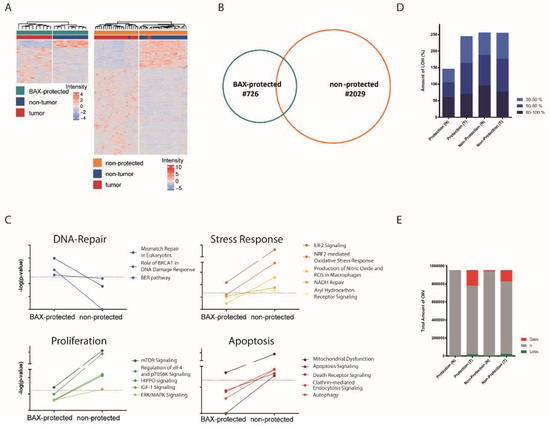 (A) Unsupervised clustering analyses based on corresponding genes differently regulated between non-tumorous and tumor tissue in BAX-protected and non-protected subgroups. (B) Venn diagram demonstrating the overlap of differentially regulated genes in BAX-protected and non-protected tumor subgroups during malignant transformation. (C) Activated signaling pathways during malignant transformation examined by comparative ingenuity pathway analyses based on BAX-protected and non-protected tumor subgroup transcriptome profiles. (D) Presence of loss of heterozygosity (LOH) in percentage based on SNP array analyses for BAX-protection and non-protection in non-tumorous and tumor tissue. (E) Copy number alterations based on SNP array analyses for BAX-protected and non-protected tumor subgroup in non-tumorous and tumor tissue.