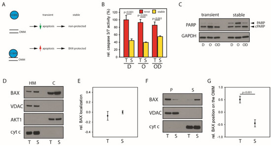 (A) Cells were challenged either with mainly cytosolic BAX (S184E, top) or predominantly mitochondrial BAX (S184V, bottom). The experiments were designed to increase the apoptosis predisposition through a large mitochondrial BAX pool, testing the hypothesis that cells challenged with predominantly mitochondrial BAX select for genetic alterations associated with BAX-protected tumors. (B) Caspase 3/7 activity induced by 1 µM Daunorubicin (D), 30 µM Olaparib (O) or the combination (OD) for 24 h in HCT116 BAX/BAK DKO cells with either transient (red, trnst, T) or stable (yellow, stable, S) expression of predominantly mitochondrial BAX S184V. Data ± SEM. N = 3 and p-values according to one-way ANOVA using the Holm–Sidak method. Data adjusted to BAX S184V expression. (C) Western blot analysis of caspase substrate PARP cleavage in HCT116 BAX/BAK DKO cells with either transient or stable expression of predominantly mitochondrial BAX S184V as in panel (G) following treatment with 1 µM Daunorubicin (D), 30 µM Olaparib (O), or the combination (OD). N = 3. (D) Subcellular localization of wild type BAX transiently (T, 4 h) or stably (S) expressed in HCT116 BAX/BAK DKO cells after fractionation analyzed by Western blot. Separation of cytosol (C) and heavy membrane fraction (HM, mitochondria) was controlled using AKT1 and VDAC or cyt c, respectively. N = 3. (E) Relative wild type BAX localization (log10 scale) after transient (T) and stable (S) expression in HCT116 BAX/BAK DKO cells analyzed by fractionation depicted in D. (F) Carbonate extraction (pH 11.5) of wild type BAX transiently (T, 4 h) or stably (S) expressed in HCT116 BAX/BAK DKO cells analyzed by Western blot. Separation of supernatant (S) containing OMM-associated proteins and pellet (P) with OMM-integral proteins was controlled using cyt c (released during the procedure) and VDAC, respectively. N = 3. p-value according to t-test. (G) Relative wild type BAX distribution on the OMM between OMM-integral and OMM-associated protein pool determined by carbonate extraction (log10 scale) after transient (T) and stable (S) expression in HCT116 BAX/BAK DKO shown in F.