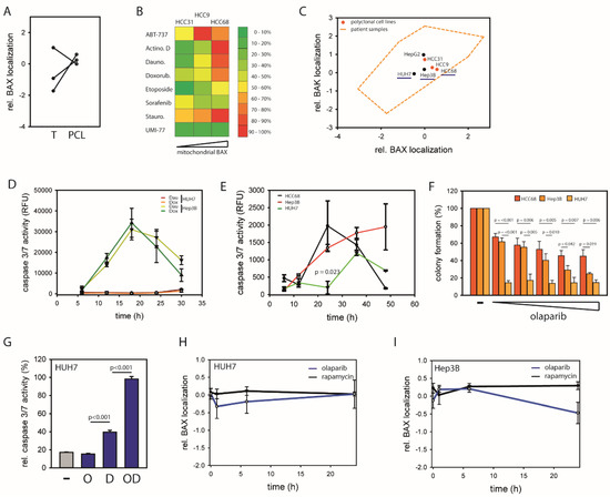 (A) Relative BAX localizations of polyclonal cell lines (PCL, HCC9, HCC31, and HCC68) and the corresponding tumor samples (T) are displayed in log10 scale. (B) Comparison of apoptotic response of PCL (HCC9, HCC31, and HCC68) after 24 h treatment with ABT-737 (1 µM), ActinomycinD (ActinoD, 1 µM), Daunorubicin (Dauno, 1 µM), Doxorubicin (Doxorub, 5 µM), Etoposide (100 µM), Sorafenib (5 µM), Staurosporine (Stauro, 1 µM), or Umi-77 (1 µM) according to caspase 3/7 activation. (C) Relative BAX localization vs. relative BAK localization (double log10 scale) for HepG2 cells, HUH7 cells and Hep3B cells in black. For comparison area of relative localizations in 34 HCC patient samples (orange broken line) and 3 polyclonal cell lines (red) are displayed. HUH7 cells, Hep3B cells and HCC68 cells (underlined in blue) share a similar BAK localization but show the full range of different BAX localizations in the tested cell lines. (D) Caspase 3/7 activity in HUH7 cells and Hep3B cells in response to 1 µM Daunorubicin or 5 µM Doxorubicin treatment for 24 h. Data ± SEM. N = 3. Apoptotic response of both cell lines after treatment with ABT-737 (1 µM), ActinomycinD (ActinoD, 1 µM), Etoposide (100 µM), Sorafenib (5 µM), Staurosporine (Stauro, 1 µM), or Umi-77 (1 µM) in Supporting Figures S19–S21. (E) Caspase 3/7 activity induced in HUH7 (green) Hep3B (red) and HCC68 cells (black) in response to 5 µM Rapamycin. Data ± SEM. N = 3. (F) Clonogenic survival of HCC68 (red), Hep3B (orange) or HUH7 (yellow) following incubation with 0, 10, 20, 30, 40, or 50 µM Olaparib for 72 h. Data represent averages ± SEM. N ≥ 3 and p-values according to one-way ANOVA using the Holm–Sidak method. (G) Caspase 3/7 activity induced by 30 µM Olaparib (O), 1 µM Daunorubicin (D) or the combination (OD) in HUH7 cells. Data ± SEM. N = 3. (H) Changes of relative BAX localization of HUH7 cells with either Olaparib (black) or Rapamycin (gray) within 24 h. Data represent averages ± SEM. N ≥ 3 (I) Effect of Olaparib (black) or Rapamycin (gray) on relative BAX localization of Hep3B cells within 24 h. Data represent averages ± SEM. N ≥ 3.