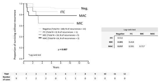In conclusion, based on the results of our study and a critical review of the literature, there is growing evidence that the presence of MIC in SLN is associated with significant negative impact on the survival, which is similar to patients with MAC. Despite caveats in current evidence and discrepancies in available data, patients with MIC should be managed with the same criteria as patients with MAC, and SLN biopsy and its ultrastaging should be implemented into routine management. SLN ultrastaging is undoubtedly a substantially more time and cost consuming practice if compared to routine LN assessment; however, it enables the identification of an additional subgroup of around 10% of patients with MIC who would be otherwise missed. If cases with all types of metastases (MAC, MIC, ITC) are excluded, a remaining subgroup of LN negative patients has an excellent prognosis.