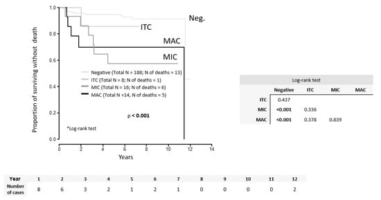 Similarly, OS was significantly worse in groups with MAC (p < 0.001) and MIC (p < 0.001) in comparison to LN-negative patients (Figure 2).