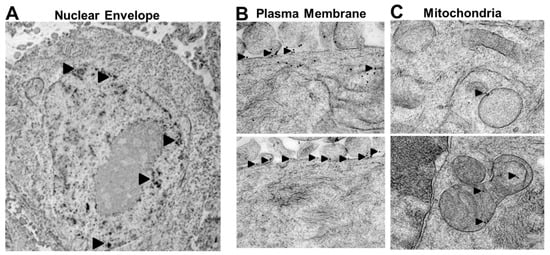 Figure 1. Subcellular localization of Rlip imaged by electron microscopy. Immunogold EM on MCF7 cells was performed as described in the Materials and Methods. Electron microscopy was done on a FEI Tecnai 12 transmission electron microscope equipped with a CCD camera. Black arrow heads point to staining of (A) nuclear membrane as well as of the (B) plasma membrane and (C) mitochondria. Magnification of the image: 11,000×.
