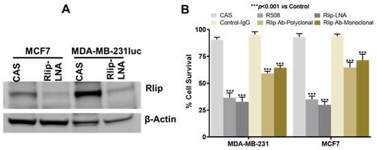 Figure 2. Effects of Rlip depletion on breast cancer cell survival. (A) A representative Western blot showing the efficacy of transfection with Rlip-LNA. Cells were transfected for 48 h, and expression level of Rlip was determined using Western blots. β-actin was used as a loading control. (B) Effect of Rlip depletion by Rlip antisense and Rlip antibodies on breast cancer cell survival: MCF7 and MDA-MB-231 cells were transfected with Rlip antisense (R508 or LNA) or with Rlip monoclonal (clone RALBP1-A192 from Sigma, St. Louis, MO, USA) or custom polyclonal (Rlip IgG (aa171–185) antibodies for 48 h, as described in the Materials and Methods. Following treatment, cells were analyzed by MTT assay. The data were analyzed using two-tailed Student’s t-test. A one-way analysis of variance (ANOVA) with post-hoc Tukey’s test was applied to compare all groups. The data presented shows significant (*** p < 0.001) cell death after Rlip depletion either by antisense or Rlip antibodies as compared to their corresponding controls. The expressed values are means ± SD. (n = 3 independent experiments with eight replicates).