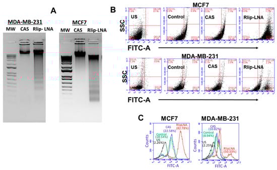 We previously reported that Rlip depletion/inhibition can inhibit cancer cell growth and induce apoptosis [52,53,54]; therefore, we examined whether breast cancer cell death caused by Rlip-LNA was due to apoptosis. The DNA laddering assay was used to examine apoptosis in CAS or Rlip-LNA treated MCF7 and MDA-MB-231 cells (Figure 3A). Apoptotic DNA fragmentation was evident from agarose gel pictures showing the appearance of DNA laddering in MDA-MB-231 and MCF7 cells treated with the Rlip-LNA, but not the control antisense (Figure 3A). The laddering pattern is a consequence of sequential DNA cleavage by caspase-activated DNAase during the execution phase of apoptosis. These results suggest that the rate of apoptosis by Rlip-LNA was similar in the two cell lines. The apoptotic mechanism of cell death by the Rlip-LNA was further validated by a flow cytometric terminal deoxynucleotidyl transferase dUTP nick end labeling (TUNEL) assay. Flow cytometry analysis indicated that the cellular apoptosis rate increased after treatment with Rlip-LNA (200 ng/mL for 24 h) relative to the vehicle control or the CAS (Figure 3B,C). Both the ER+ and TNBC cell lines showed an increase in the rate of apoptosis with Rlip-LNA treatment. It appears from the bimodal MDA-MB-231 scatterplot and histogram (Figure 3B,C) that these cells had a dimorphic population, possibly because of a difference in cell cycle, heterogeneity in growth rate, or acquired partial cross-resistance towards Rlip-LNA treatment. Together, these results support an apoptotic mechanism for breast cancer cell death by Rlip-LNA treatment.