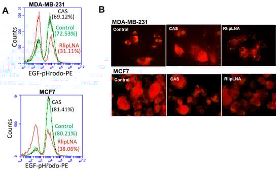The effect of Rlip knockdown/depletion by Rlip-LNA and the respective scrambled control antisense (CAS) on EGF endocytosis was studied in the MCF7 and MDA-MB-231 cell lines by immunofluorescence and flow cytometry analysis. The cells were transfected by reverse transfection. Briefly, Rlip-LNA, CAS and Lipofectamine complexes were prepared as follows: Rlip-LNA or CAS (10 µg/mL final concentration) was diluted in 500 μL serum-free Opti-MEM Medium and added to culture wells directly, and 4 µL of Lipofectamine 3000 reagent was added to each well containing antisense RNA complex. The complex was mixed gently and incubated at room temperature for 30 min. Cells were suspended in complete growth medium without antibiotic. After 30 min, 500 µL of cell suspension containing 4 × 104 cells was added to each well, having antisense oligo and Lipofectamine complex. Contents were mixed gently. Cells were incubated in a 5% CO2 incubator at 37 °C. After 24 h, cells were kept on ice for 20 min then washed with cold live-cell-imaging solution (LCIS) containing 2 mM glucose and 1% BSA, and incubated with 2 µg/mL EGF-pHrodo (Invitrogen) according to the manufacturer’s instructions. Cells were then incubated at 37 °C in a humidified chamber for 30 min followed by washing with LCIS. DAPI solution (0.02 µg/mL) applied for 5 min was used to stain nuclei. DAPI solution was removed and citrate buffer was added to each well. Slides were analyzed using a fluorescence microscope (Olympus America, Melville, NY, USA). Photographs taken at identical exposure settings at 200× magnification are presented. The effect of Rlip knockdown on endocytosis was further checked by flow cytometry.