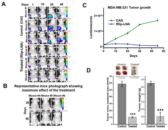 Figure 7. Effect of Rlip-LNA on growth rate of MDA-MB-231luc tumors. (A) Tumor burden was monitored via the luminoscore. Cells were injected as described in the Materials and Methods. Five mice per group were used and the experiment was repeated once. Seven drug injections were given. Control mice received the same number of injections of CAS in an equivalent volume (200 μL). Images shown are from three mice from each group from Day 10 to the end of study. As seen, the effect of Rlip-LNA on the luminoscore was very significant on Day 40. (B) Panel shows the images of the three Rlip-LNA-treated mice that showed the greatest effect of treatment at Days 20 and 40. Disease was undetectable by the study endpoint. (C) Plot shows weekly tumor growth as measured by IVIS imaging, and units are in luminoscores for each group. Rlip-LNA-treated mice showed significant (*** p < 0.001) reduction in luminescence at each time point. (D) Histogram shows the tumor cross-sectional areas and tumor weights at the end of the study. Results are reported as mean ± SD. *** p < 0.001, as compared to the untreated group of mice, as analyzed by two-tailed Student’s t-test.