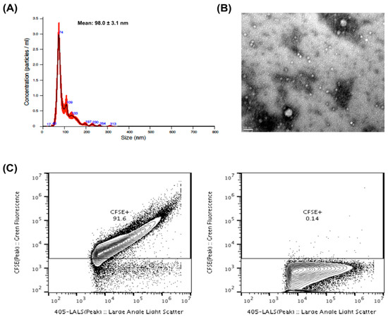The EVs were characterized according to size, shape and purity. The NTA analysis indicated that the vast majority of isolated EVs presented a size range between 50 and 200 nm, which is consistent with the size of exosomes and small microvesicles (Figure 1A). A transmission electron microscopy (TEM) image (Figure 1B) shows the variability of sizes and morphology present in EVs from purified PFP. We also utilized EVs flow cytometry to confirm the purity of our EV isolates [39]. In all cases, more than 80% of particles present in our isolates corresponded to CFSE+ vesicular structures (Figure 1C).