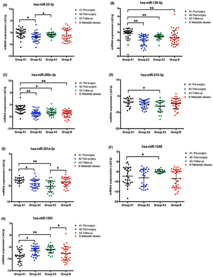 EV-derived miRNA expression (-ΔCq) in pre-surgery, post-surgery, and follow-up samples (Group A) and metastatic disease samples (Group B) of ccRCC patients. (A) hsa-miR-25-3p plasmatic EV-expression; (B) hsa-miR-126-5p plasmatic EV-expression; (C) hsa-miR-200c-3p plasmatic EV-expression; (D) hsa-miR-210-3p plasmatic EV-expression; (E) hsa-miR-301a-3p plasmatic EV-expression; (F) hsa-miR-1246 plasmatic EV-expression; (G) hsa-miR-1293 plasmatic EV-expression; * p < 0.05, ** p < 0.001.