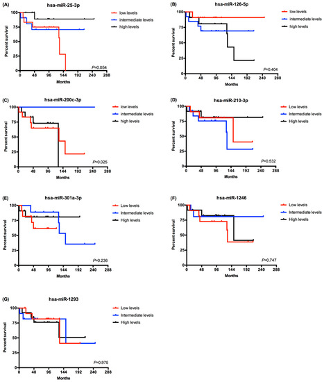 Since the patients from group A were alive with no evidence of disease on their last observation, we carried out the survival analysis on the patients from group B (Figure 3). The patients were divided in tertiles according the EV-derived miRNA levels using the –ΔCq values of each miRNA (high, intermediate and low levels). Regarding the 8 EV-derived miRNAs analyzed, only the hsa-miR-200c-3p presented statistical significant differences. Patients with a high or low expression level had a lower overall survival compared to patients with intermediate levels of hsa-miR-200c-3p (log rank Mantel Cox test, p = 0.025) (Figure 3C). In addition to that, patients with lower levels of has-miR-25-3p presented a tendency for a lower overall survival (log rank Mantel Cox test, p = 0.054) (Figure 3A).