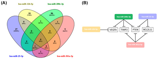 (A) Venn diagram of the validated target genes of hsa-miR-25-3p, hsa-miR-126-5p, hsa-miR-200c-3p and hsa-miR-301a-3p obtained using Venny 2.1 (https://bioinfogp.cnb.csic.es/tools/venny/). (B) Representation of the overlaping target genes of hsa-miR-25-3p, hsa-miR-126-5p, hsa-miR-200c-3p and hsa-miR-301a-3p.
