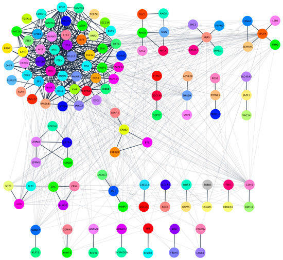 In order to explore the biological impact of the four-miRNA signature in patients with localized disease, we analyzed their 135 target genes with the STRINGapp from Cytoscape software (v3.7.2). A total of 134 of the 135 protein coding genes were filtered into a protein-protein interaction (PPI) network with 134 nodes and 889 edges that presented significant enrichment (p = 1.0 × 10−16). For a deeper understanding of the protein interactions we performed a Markov clustering (MCL), which resulted in the clustering of the proteins into 26 clusters according to their STRING interaction score (Figure 5, Table S3).