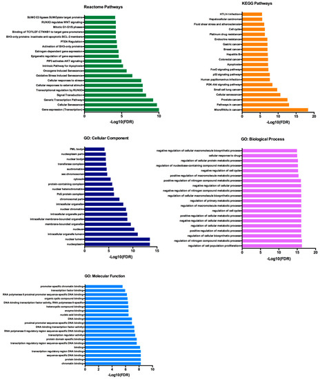 For the functional enrichment analysis, we focused on the largest cluster, which reduced the initial network of 134 proteins to 53 proteins. This cluster contained 53 nodes, with PTEN and BCL2L11 among them, and 328 edges and retained the significant PPI enrichment (p = 1.0 × 10−16). The functional enrichment analysis was performed with an FDR threshold of 1%, and the redundant terms were eliminated using a redundancy cutoff of 0.5, which resulted in a total of 549 functional enriched terms among the Reactome, KEGG, and GO categories (Tables S4–S8). The top 20 enriched terms for each category are represented in Figure 6.