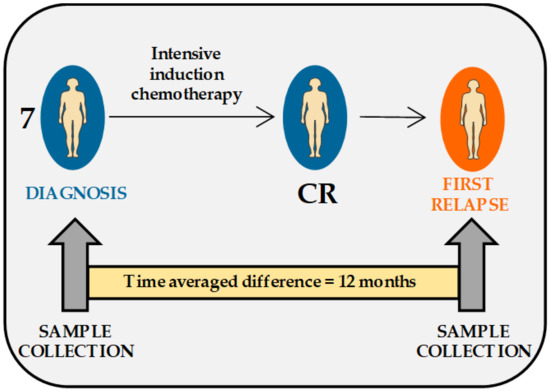 Relapses derive from minimal residual disease (MRD) [6,7,8] developing from the original dominating clone, from a minor subclone, or through progression from the original leukemic or preleukemic stem cells [9,10,11]. Regardless of the origin, AML relapsed cells have an increased chemoresistance in common [5]. Relapsed AML patients are usually treated with salvage cytotoxic therapy, but current clinical trials test pathway-targeted agents and immunotherapy-based approaches [12]. Such approaches depend on the knowledge of potential therapeutic targets in relapsed AML cells. [13,14,15].
