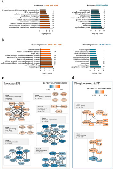 A protein–protein interaction (PPI) network of the differentially expressed proteins confirmed the increased abundance of mitochondrial, ribosomal, mRNA-, rRNA-, and tRNA-processing factors (Figure 2c, Cluster 1–4) at first relapse. RNA-splicing and -binding proteins were also more phosphorylated at first relapse (Figure 2d, Cluster 1,2).