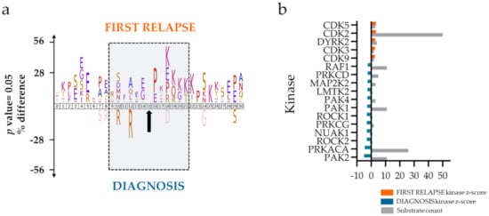 A separate kinase-substrate enrichment analysis (KSEA) [25,26], using non-differentially regulated phosphorylation sites as background, supported an increased activity of CDKs in the FIRST RELAPSE group and of PRKACA, PRKC, and serine/threonine protein kinase PAK2 in the DIAGNOSIS group (Figure 3b).