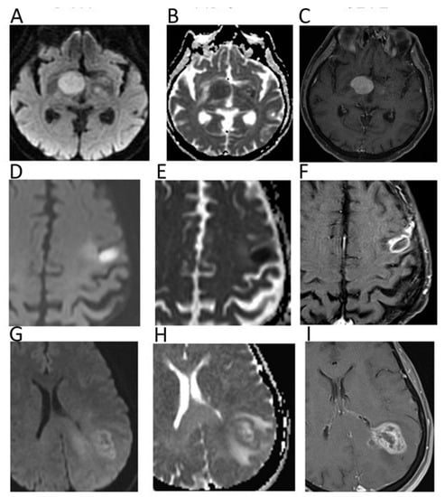 Diffusion weighted imaging (DWI) b = 1000 images (A,D,G), corresponding apparent diffusion coefficient (ADC) maps (B,E,H), and contrast–enhanced T1 w images (C,F,I) of patients with histologically proven primary central nervous system lymphoma (A–C), cerebral abscess (D–F), and glioblastoma (G–I). Mean ADC values in lymphoma (0.648 × 10−3 mm2/s) and in the central portion of the abscess (0.510 × 10−3 mm2/s) were lower than in glioblastoma. In particular, mean ADC values were higher in the necrotic core of the GBM (1.082 × 10−3 mm2/s) in comparison to the abscess.