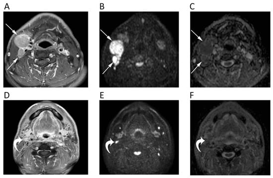 MRI scans of a 65-year-old male patient with oropharyngeal squamous cell carcinoma and lymph nodal metastases. Contrast-enhanced T1w (A), high b-value DWI (B), and corresponding ADC map (C) before chemotherapy show round enlarged right cervical lymph nodes (arrows) with restricted pattern of diffusion (mean ADC: 0.891 × 10−3 mm2/s). The same images after treatment (D–F) show the good response to chemotherapy with normal size and unrestricted pattern of diffusion of the cervical lymph nodes (curved arrows).