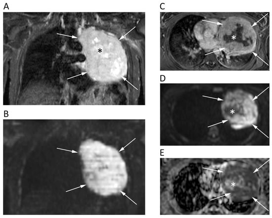 Chest MRI of a 62-year-old male patient with lung carcinoma. The coronal short tau inversion recovery (STIR) (A), coronal reconstruction of b 1000 DWI image (B), axial post-contrast T1w image (C), axial b = 1000 DWI image (D), and corresponding ADC map (E) show a large tumor in the left lung (arrows) with an restricted pattern of diffusion. Note the central necrotic areas (asterisks) presenting fluid signal intensity on STIR (A), absent contrast enhancement (C) and unrestricted pattern of diffusion (D,E) with mean ADC of 2.168 × 10−3 mm2/s. Conversely, the solid component of the tumor shows strong contrast enhancement and very low ADC values (0.818 × 10−3 mm2/s).