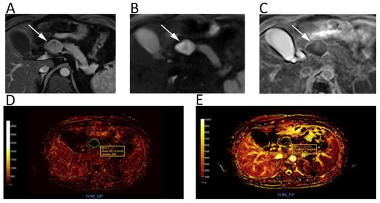 DWI is widely adopted as a part of pancreas MRI protocol. Pancreatic tumors, even if small, almost invariably show diffusion restriction, presenting as focal hyperintense areas on high-b-value DWI with corresponding low ADC. Previous studies reported high diagnostic performance for identification of pancreatic ductal adenocarcinoma using DWI, with reported accuracy, sensitivity, and specificity of 96%, 96%, and 99%, respectively [40,41]. Similarly, Kartalis et al. found very high diagnostic performance of DWI (92% sensitivity, 97% specificity, 96% accuracy) to differentiate malignant (mean ADC 1.4 ± 0.3 × 10−3 mm2/s) from benign (2.57 ± 1.17 × 10−3 mm2/s) pancreatic lesions [42]. Notably, the DWI appearance of PDAC can be very similar to that of autoimmune pancreatitis, which presents as a focal pancreatic enlargement with even lower ADC, due to fibrosis and inflammatory cell infiltration [40,41]. DWI has been also found to improve the detection of pancreatic neuroendocrine neoplasms (pNENs) [40]. Nevertheless, concurrent chronic pancreatitis may represent a confusing factor for the identification of pancreatic lesions [41]. Further, the differentiation of benign and malignant pancreatic lesions based only on ADC quantification is not so straightforward because of a wide overlap of ADC values [40,41]. Controversial results were also found to differentiate cystic lesions by means of DWI alone [40]. More consistent results have been described by using IVIM-DWI (Figure 6): perfusion-related parameters (i.e., perfusion fraction and fast component of diffusion) showed excellent inter-observer agreement and accuracy for identifying solid pancreatic lesions, and distinguishing malignant from benign intraductal papillary mucinous neoplasms [40,41].