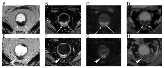MRI scans of a 66-year-old female patient with rectal cancer at the initial diagnosis and two months later after neoadjuvant chemotherapy. Axial T2w image (A) and axial post-contrast fat-suppressed 3D GRE T1w image (B) show the tumor along the posterior rectal wall (arrows) with high signal intensity on the axial b = 600 DWI image (C) and low ADC (mean ADC: 0.651 × 10−3 mm2/s) on the corresponding ADC map (D). Post-treatment axial T2w image (E) shows the reduction in size of the lesion (arrowheads) with decrease of contrast enhancement (F) and slight increase of ADC values (G,H).