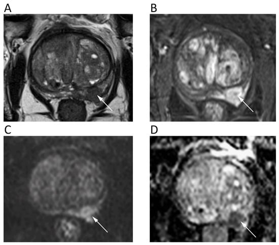 A 68-year-old male patient with prostate cancer. Axial T2w (A) and post-contrast fat-suppressed T1w (B) images show a hypointense nodule in the left peripheral zone (arrows) with high signal intensity on b = 1000 DWI image (C) and restricted pattern of diffusion on the corresponding ADC map (D).