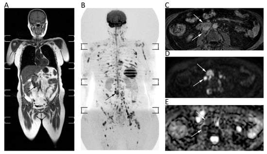 Whole-body MRI of a 58-year-old female patient with non-Hodgkin lymphoma. Whole-body T1w (A) and coronal MIP grey-scale inverted DWI (B) show multiple nodal and bone locations of disease. Note the periaortic lymph nodal locations (arrows) with moderate contrast enhancement on axial fat-suppressed 3D GRE T1w (C) and restricted pattern of diffusion on axial b = 800 DWI (D) and corresponding ADC map (E, mean ADC: 0.761 × 10−3 mm2/s).