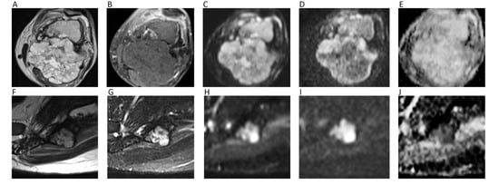 - Choi, Y.J.; Lee, I.S.; Song, Y.S.; Il Kim, J.; Choi, K.-U.; Song, J.W. Diagnostic performance of diffusion-weighted (DWI) and dynamic contrast-enhanced (DCE) MRI for the differentiation of benign from malignant soft-tissue tumors. J. Magn. Reson. Imaging 2019, 50, 798–809. [Google Scholar] [CrossRef]