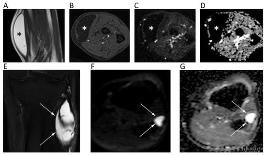 MR images of an intramuscular lipoma of the forearm (A–D) and a perineural ganglion cyst of the leg (E–G) of two different patients. The lipoma (asterisk) shows a homogeneous high signal on coronal T2w (A) and a low signal on axial fat-suppressed T1w (B), b = 800 DWI (C); the corresponding ADC map (D). Note the absence of diffusion restriction and the intrinsically low ADC values of this benign lipomatous lesion. The ganglion cyst (arrows) displays high signal intensity on coronal fat-suppressed T2w (E), axial b = 800 DWI (F), and axial ADC map (G). High b-value DWI shows high signal due to T2 shine-through effect; the ADC map confirms the absence of diffusion restriction and the cystic nature of the lesion (ADC: 2.603 × 10−3 mm2/s).