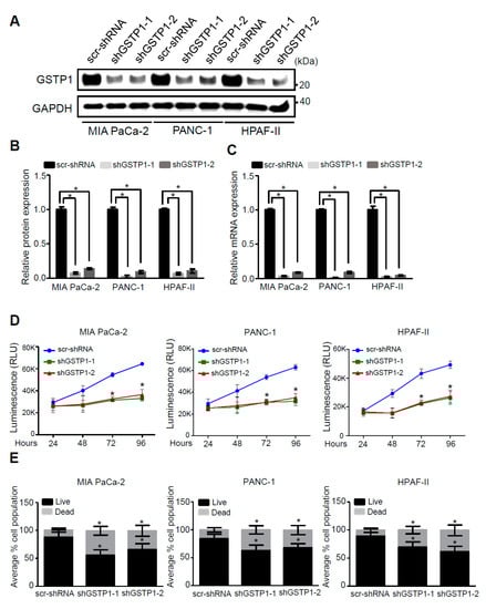 GSTP1 knockdown impairs PDAC cell viability. GSTP1 was knocked down in MIA PaCa-2, PANC-1, and HPAF-II PDAC cells using two independent shRNAs (shGSTP1-1 and shGSTP1-2) and expression was confirmed by (A,B) Western blotting and (C) quantitative real-time (qRT)-PCR analysis. Western blot data were normalized to GAPDH for each cell line, and relative protein expression is shown for the scrambled control shRNA (scr-shRNA) compared to the GSTP1 shRNA sequences. Protein and mRNA levels of GSTP1 in scr-shRNA were compared to shGSTP1-1 and shGSTP1-2. The images are representative of three independent experiments. Student’s t-test was used to evaluate the significance in the difference of GSTP1 expression among different groups. (D) CellTiter Glo® assays were used to detect the average cell viability of control and GSTP1 knockdown MIA PaCa-2, PANC-1, and HPAF-II cells for two independent experiments with eight technical replicates for each. The y-axis represents the luminescence recorded after 24, 48, 72, and 96 h. The luminescence (cell viability) was compared between scr-shRNA and shGSTP1-1 and shGSTP1-2 independently. Student’s t-test was used to analyze the significance between knockdown groups and the control. RLU: relative luminescence units (E) 50,000 cells for control and GSTP1 knockdown MIA PaCa-2, PANC-1, and HPAF-II were seeded and the number of viable cells was counted using a trypan blue dye exclusion test after 72 h. The live and the dead cell populations for shGSTP1-1 and shGSTP1-2 were compared to the scr-shRNA. Student’s t-test was used to analyze for potentially significant differences. * denotes statistically significant differences between either GSTP1 knockdown and the control (p < 0.05). Unprocessed images for the Western blotting results are shown in Figure S1.