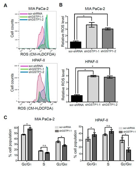 GSTP1, being a detoxification enzyme, has a key role in maintaining cellular homeostasis by scavenging reactive oxygen species (ROS) and protecting cells from oxidative damage [29]. We hypothesized that the growth inhibitory effects of knocking down GSTP1 result from the accumulation of ROS in PDAC cells. Control and GSTP1 knockdown (shGSTP1-1) MIA PaCa-2 and HPAF-II cells were stained with the fluorescent dye CM-H2DCFDA to detect ROS, and fluorescence was determined using flow cytometry. We show GSTP1 knockdown elevates ROS levels by at least three-fold in PDAC cells (Figure 3A,B).